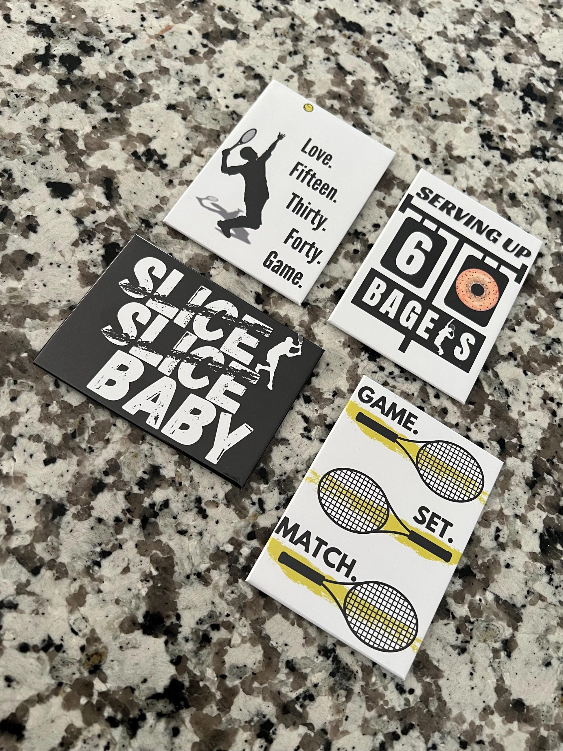 Tennis fans know the joke — nothing’s sweeter than serving up a bagel set! This witty magnet pairs your love of the game with a tasty pun, making it a must-have for players, coaches, and fans alike.