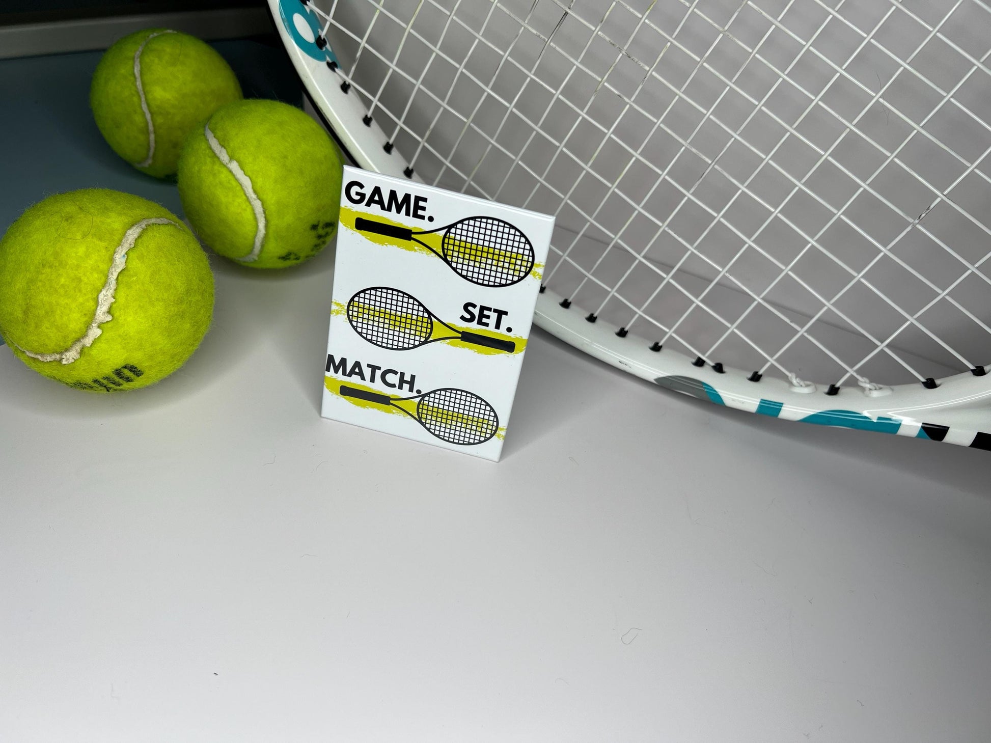 Classic, bold, and straight to the pointโjust like your winning shot. This magnet features crossed tennis rackets and the iconic phrase โGame. Set. Match.โ, making it the perfect gift for players, coaches, or anyone who lives for match day.